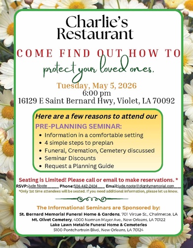 Seating is limited. Please RSVP to Jude Noote, (504) 442-2404 or email Jude.noote@dignitymemorial.com