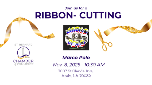 St. Bernard Chamber of Commerce invites the community to join Chamber Members, Parish Government, Council Members, and Community leaders as we celebrate Marco Polo coming to St. Bernard Parish with a Ribbon Cutting Ceremony and Photo-op! The ceremony will start at 10:30 AM on Saturday, November 8th, located at 7007 St. Claude Ave., Arabi, LA 70032.