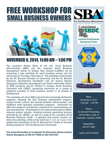 CHALMETTE – The Louisiana District Office of the U.S. Small Business Administration (SBA) and the Louisiana Small Business Development Center of Greater New Orleans (LSBDC) will be presenting a free workshop for small business owners and the community on Thursday, November 6. The workshop will be hosted by the St. Bernard Chamber of Commerce and the St. Bernard Economic Development Foundation and will feature Melissa Daigrepont, Economic Development and Public Information Officer for SBA Louisiana, and Dr. Michael P. Cusack, Senior Business Consultant with LSBDC, presenting information on a variety of programs available to small business owners in all phases of development.